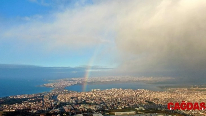 İstanbul'da sabah saatlerinde yer yer etkili olan yağmur, beraberinde gökkuşağının oluşmasına neden oldu. Havadan çekilen İstanbul semalarında oluşan gökkuşağı kartpostallık görüntüler oluştururken bir yandan ise karabulutların şehre doğru geldiği gözüktü.