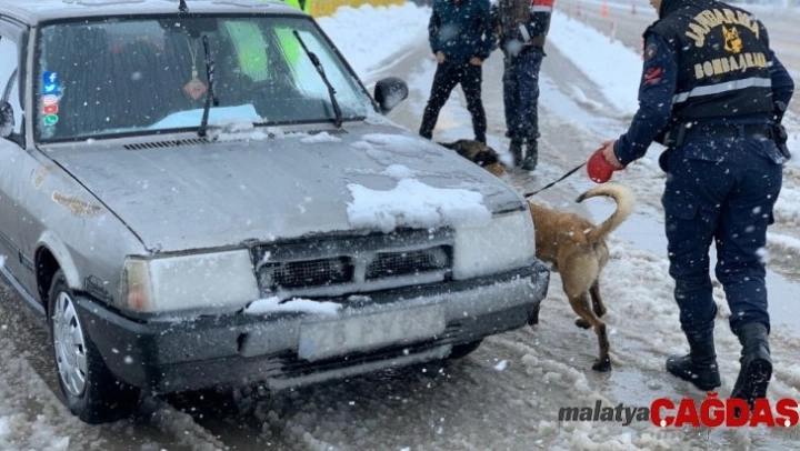 Eskişehir'de, İl Jandarma Komutanlığı tarafından olumsuz hava şartlarında muhtemel kazaları azaltmak, sürücüleri bilgilendirmek ve şüpheli araçların tespiti için trafik uygulaması gerçekleştirildi. Yapılan uygulamada ekipler, durdurulan şüpheli araçlar ise hassas burunlu bomba arama köpeğiyle arandı.