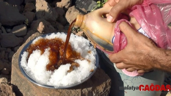 Bitlis'te vatandaşlar ve yaylacılar yüksek rakımlı dağların tepesinde bulunan karlara kattıkları pekmezle hazırladıkları 'karlı pekmez'le serinliyor.