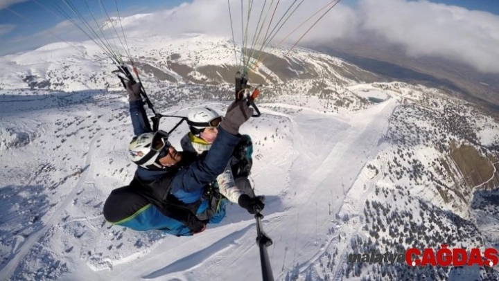 Erzincan Ergan Dağı Kayak Merkezi'nin zirvesinden paraşütle kendilerini boşluğa bırakan baba Sedat Cengiz ve kızı Kübra Cengiz, muhteşem kış manzarası eşliğinde gökyüzünde heyecan ve adrenalin keyfini çıkarıyor.