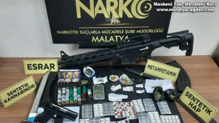 Edinilen bilgiye göre, Malatya Emniyet Müdürlüğü Narkotik Suçlarla Mücadele Şube Müdürlüğü görevlileri bir ihbarı değerlendirdi. Bir şahsın ikametinde yapılan aramada, 154 adet yeşil reçeteye tabi hap, 28 gram esrar, 12 gram sentetik kannabinoid,15,5 gram metamfetamin, 1 adet uzun namlulu silah, 1 adet ruhsatsız tabanca ele geçirildi.