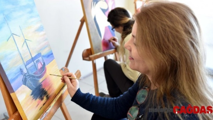 Tepebaşı Belediyesi Hedef Batıkent Belde Evi'nde yetişkinlere yönelik açılan resim kursuna katılan kadınlar, hem resim yapmanın tekniklerini öğreniyor hem de sosyalleşiyorlar.
