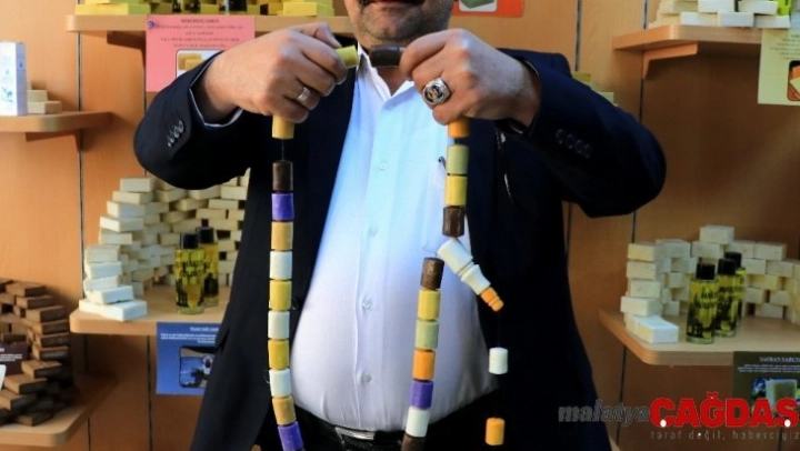 Tespih ustası Ahmet Ünverdi de, sabundan tespih yapmanın zor olduğunu belirterek, 'Her türlü malzemeden tespih yapıyorum. Sabundan tespih yapma fikri ilginç geldi. Malzeme yumuşak olduğu için 10 gün sürdü. Sadece bıçakla yontarak yapıyoruz. Tamamen el işçiliği. Su değmemesi lazım. Sadece süs amaçlı yaptık' ifadelerini kullandı.