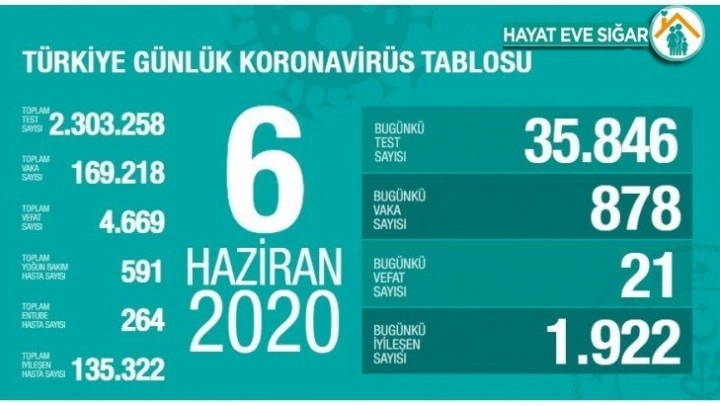 Sağlık Bakanlığından yapılan açıklamaya göre, son 24 saatte 21 kişi korona virüsten hayatını kaybetti, toplam can kaybı ise 4 bin 669'e yükseldi. Bugün toplam 35 bin 846 test yapılırken, 878 yeni vaka tanısı konuldu, toplam vaka sayısı ise 169 bin 218 oldu. Bugünkü bin 922 kişiyle birlikte toplam iyileşen sayısı da 135 bin 322'e yükseldi. Toplam entübe hasta sayısının 264, toplam yoğun bakım hasta sayısının ise 591 olduğu açıklandı.