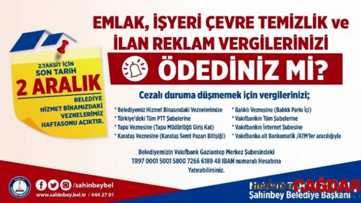 Şahinbey Belediyesi, 2019 yılı Emlak, İşyeri Çevre Temizlik, İlan ve Reklam Vergisi ödeme süresinin 02 Aralık 2019'da sona ereceği yönünde hatırlatmada bulundu.