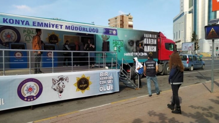 Konya İl Emniyet Müdürlüğü Narkotik Suçlarla Mücadele Şube Müdürlüğü tarafından madde kullanımı ve bağımlılıkla mücadele konularında halkı bilgilendirmek amacıyla Şanlıurfa'ya Narkotik Eğitim Tırı getirildi.