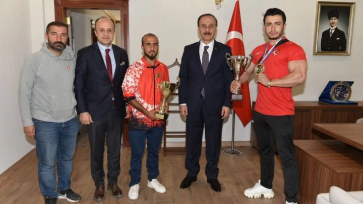Şanlıurfalı vücut geliştirme sporcusu dünya ikincisi Abdulsamet Çevik ve İstanbul Maratonunda 36 yıllık rekoru kıran Türkiye şampiyonu Hüseyin Can, Vali Abdullah Erin'i ziyaret ederek madalyalarını takdim ettiler.
