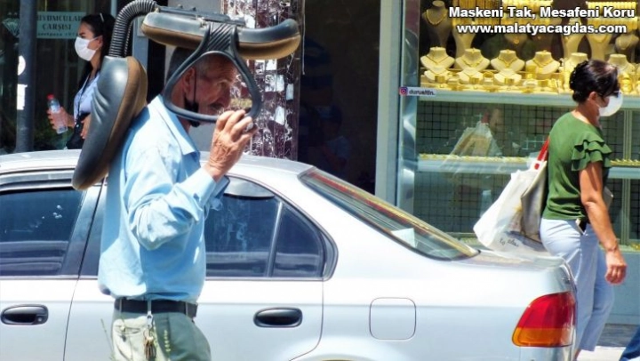 Elazığ'da sıcak havalar her geçen gün etkisini göstermeye devam ederken vatandaşlardan da alışılmışın dışında korunma yöntemleri geliyor. Kent merkezinde bir vatandaş, güneş ışınlarından korunmak için kafasında koltukla gezmesi ilginç görüntüler oluşturdu.