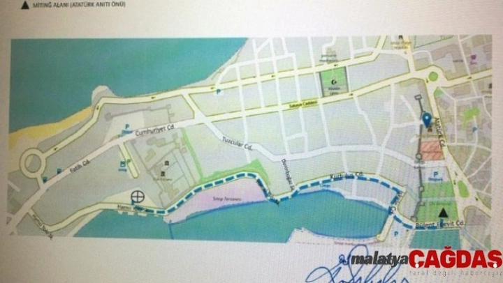 Sinop Valiliğinden yapılan açıklamada, il merkezinde yapılacak toplantı ve gösteri yürüyüşü yer ve güzergahının, 2911 Sayılı Toplantı ve Gösteri Yürüyüşleri Kanunu'nun 6.maddesine göre ilgili kurum ve kuruluşlardan alınan görüşler doğrultusunda yeniden belirlendiği bildirildi. Açıklamada, 'İlimiz merkezinde yapılacak toplantı ve gösteri yürüyüşü yer ve güzergahı, 2911 sayılı Toplantı ve Gösteri Yürüyüşleri Kanunu'nun 6. maddesinde belirtilen, 'kamu düzenini ve genel asayişi bozmayacak ve vatandaşların günlük yaşamını aşırı ve katlanılamaz derecede zorlaştırmayacak şekilde' kriterleri göz önünde bulundurularak toplanma yeri; Sinop Belediyesi Kamyon Garajı, Yürüyüş Güzergahı; Sinop Belediyesi Kamyon Garajından hareket edilerek, Hamsi Yolu Sokak, Kurtuluş Caddesi ve İskele Caddesi üzerinden, Bülent Ecevit Caddesi üzerinde bulunan Atatürk Anıtı Önü olarak belirlenmiştir. Miting alanı ise Bülent Ecevit Caddesi üzerindeki Atatürk Anıtı Önü olarak belirlenmiştir' ifadeleri kullanıldı.