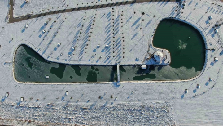Yapay gölete giden Ali Aydın, kartpostallık görüntülerin olduğunu söyleyerek, 'Şu anda Hasbahçe içerisinde bulunuyoruz. Yazın burası çok kalabalık oluyordu. Kışın da burası gerçekten çok güzel gözüküyor ve kartpostallık görüntüler var. Şu anda da gölet kısmen donmuş durumda. Hava gerçekten çok soğuk. Ördekler de göletin donmayan kısmında kalarak yüzüyorlar. Gölet buz tuttuğu için diğer taraflara geçemiyorlar. Çok farklı bir görüntü var' dedi.