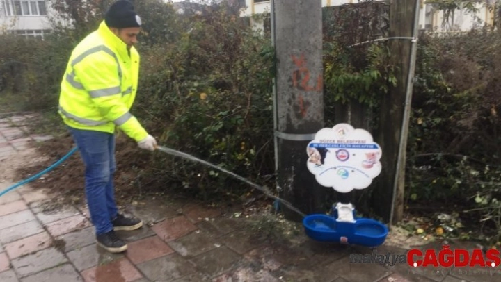 Düzce Belediyesi sokak hayvanlarının beslenmesi için büyük önem taşıyan beslenme ünitelerinin temizlik ve bakımlarını düzenli olarak sürdürüyor. Kent merkezinin muhtelif noktalarına daha önce yerleştirilen beslenme ünitelerinde temizlik ve dezenfekte çalışması yapan ekipler aynı zamanda vatandaşların ünitelerin temizliği konusunda duyarlı olmasını isteyerek 'Sokak hayvanlarının yeterli beslenmesi hem vatandaşlarımıza rahatsızlık vermemeleri açısından hem de birer canlı olarak bakımlarının eksik kalmaması amacıyla şehrimizin belli noktalarına yerleştirdiğimiz beslenme ünitelerinin dezenfekte işlemlerini düzenli olarak yapıyoruz. Vatandaşlarımızdan can dostlarımızın iyiliği için bu ünitelere çöp atmamalarını rica ediyor, duyarlı davranışları için teşekkür ediyoruz' ifadelerini kullandı.