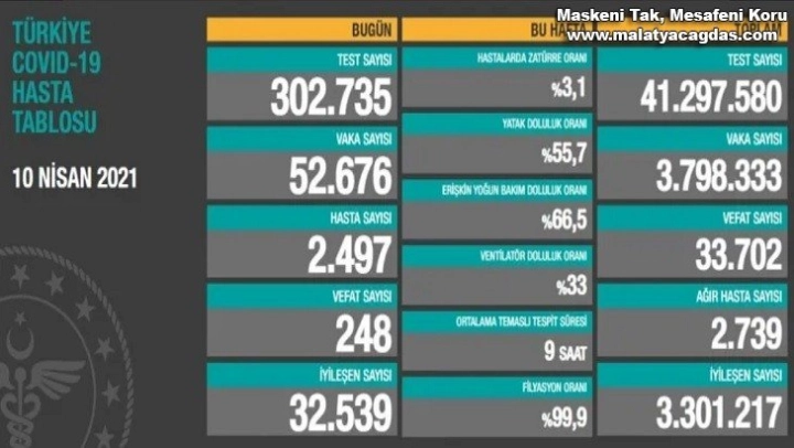 Sağlık Bakanlığının Covid-19 bilgilendirme sayfasında Türkiye'nin güncel korona virüs tablosu kamuoyuyla paylaşıldı. Tabloya göre son 24 saatte 248 kişi korona virüsten hayatını kaybetti, toplam can kaybı 33 bin 702'ye yükseldi. Toplamda 41 milyon 297 bin 580 test yapıldı. Bugün yapılan 302 bin 735 testten, 52 bin 676 yeni vaka sayısı, 2 bin 497 de yeni hasta sayısı olduğu belirtildi. Toplam vaka sayısının 3 milyon 798 bin 333, bugün iyileşen 32 bin 539 kişiyle toplam iyileşen hasta sayısının 3 milyon 301 bin 217'ye yükseldiği, toplam hastalarda zatürre oranının yüzde 3,1, ağır hasta sayısının ise 2 bin 739 olduğu açıklandı.