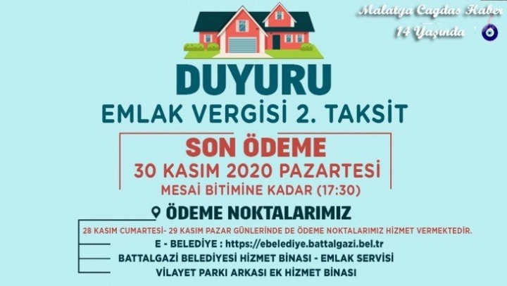 Battalgazi Belediyesi, 2020 yılı emlak ve çevre temizlik ile ilan-reklam vergilerinin ikinci taksit ödemesinin 30 Kasım 2020 tarihine kadar yapılabileceğini açıkladı. Battalgazi Belediyesi, vergilerinin ikinci taksitini yatırmak isteyen mükelleflerin mağdur olmaması için ödemelerin 30 Kasım'da sona ereceğini hatırlatarak, vatandaşların faiz yüküyle karşılaşmaması için vergilerini belirtilen tarihi kaçırmadan ödemeleri konusunda uyardı. Vatandaşların hafta içi saat: 09.00-17.30 arasında Battalgazi Belediye hizmet binasında bulunan veznelere ve Vilayet Parkı arkası Ek hizmet binasındaki veznelere 30 Kasım Pazartesi günü mesai bitimine kadar ödeme yapmaları gerekiyor.