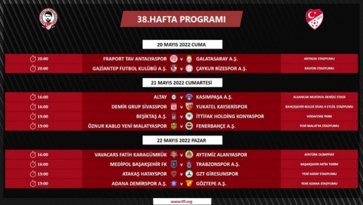 Spor Toto Süper Lig'de 2021-2022 sezonu 38. haftasında oynanacak müsabakaların programı belirlendi. Türkiye Futbol Federasyonu'ndan açıklanan program şu şekilde: