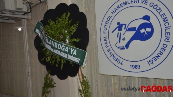 Türkiye Faal Futbol Hakem ve Gözlemciler Derneği Genel Başkanı Abdurrahman Arıcı'nın ziyaret edeceği şube önüne siyah çelenk bırakan Malatyalı sivil toplu kuruluşları, Hakem Suat Arslanboğa'ya sahip çıkılmadığı için protesto ettiler.
