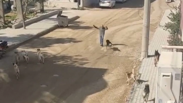 Hatay'ın Samandağ ilçesinde sürü halinde gezen sokak köpekleri bir vatandaşa saldırdı. O anlar kameralar tarafından saniye saniye kaydedildi.