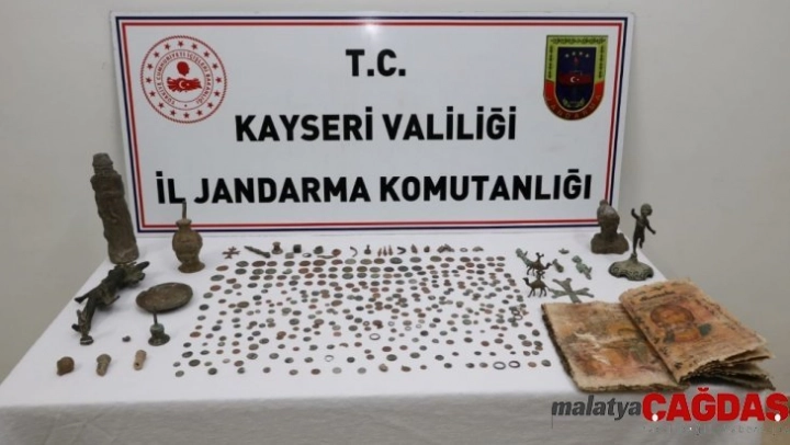 Kayseri'de jandarma ekipleri tarafından yapılan operasyonda 10 kişi gözaltına alınırken, 325 adet sikke, 36 adet tarihi obje ile 1300 yıllık deri el yazması kitap ele geçirildi.