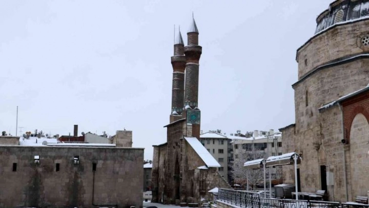 Sivas'ta etkili olan kar yağışıyla birlikte tarihi kent meydanında kartpostallık görüntüler oluştu.