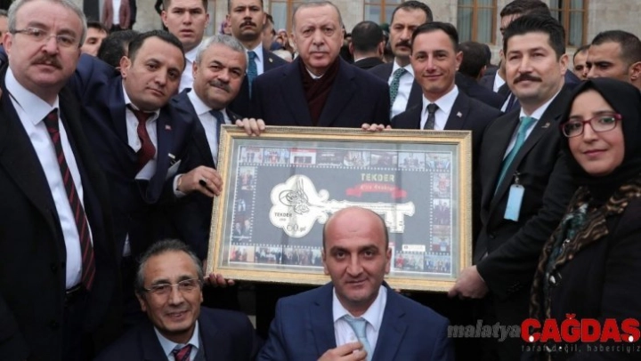 Teknikerler ve Yüksek Teknikerler Derneği (TEKDER) tarafından Cumhurbaşkanı Recep Tayyip Erdoğan'a Türkiye Büyük Millet Meclisi'nde (TBMM) grup toplantısı çıkışında altın anahtar işlemeli tablo hediye etti.