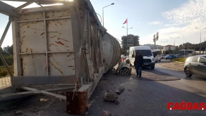 Söke-Aydın Karayolu Kuşadası Çevre Yolu Kavşağında meydana gelen kazada tır kasasında yüklü olan dev çimento silosu yola düştü.