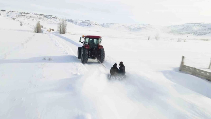 Sivas'ta yoğun kar yağışını eğlenceye dönüştüren bir vatandaş, traktöre bağladığı lastikle köy sokaklarında kayarak gezdi. O anlar aksiyon kamerası ve dron ile kaydedilirken, ortaya renkli görüntüler çıktı.