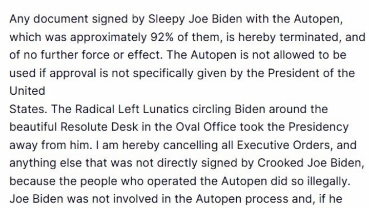ABD Başkanı Donald Trump, selefi Joe Biden döneminde hazırlanan birçok resmi belgede Biden'ın imzasının Autopen (imza makinesi) ile taklit edildiğini belirterek, Sahtekar Joe Biden tarafından doğrudan imzalanmamış olan tüm başkanlık kararnamelerini ve resmi belgeleri iptal ediyorum açıklamasında bulundu.