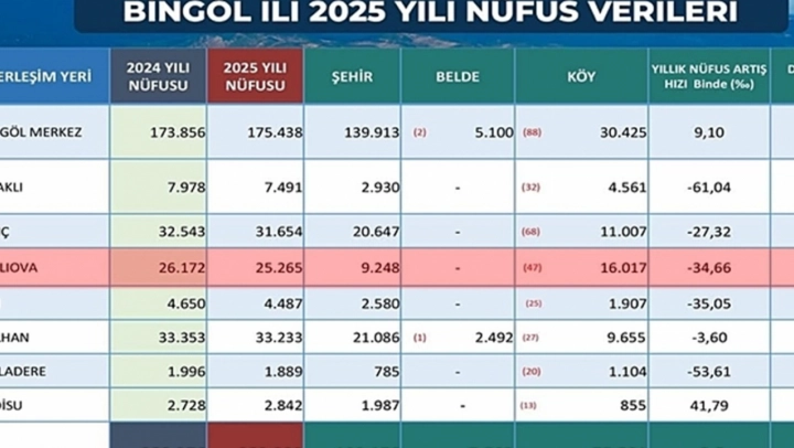TÜİK açıkladı: Karlıova'nın nüfusu 2025'te geriledi