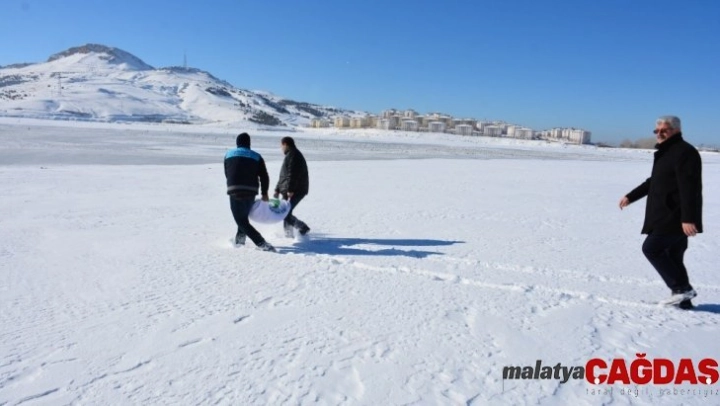 Van merkez Tuşba Belediyesi ekipleri, kar yağışı ve soğuk havalardan dolayı yaban hayvanları için Sıhke Göleti ve çevresine yem bıraktı.