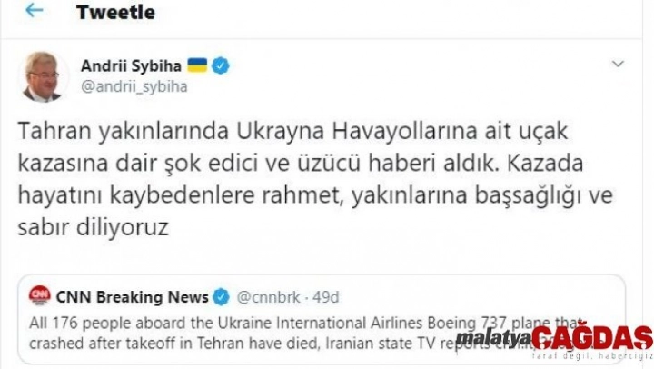 Ukrayna Türkiye Büyükelçisi Andrii Sybiha, Twitter üzerinden, 'Tahran yakınlarında Ukrayna Havayolları'na ait uçak kazasına dair şok edici ve üzücü haberi aldık. Kazada hayatını kaybedenlere rahmet, yakınlarına başsağlığı ve sabır diliyoruz' ifadelerini kullandı.