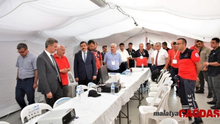 Malatya Valisi Aydın Baruş, 81 ilden UMKE personelinin katıldığı 8. Ulusal UMKE Tatbikatı için Şeker Fabrikası yerleşkesinde kurulan kamp alanını ziyaret ederek incelemelerde bulundu.