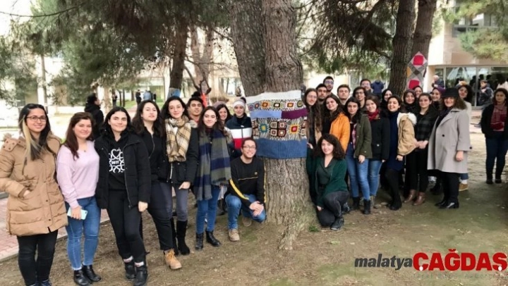 Bursa Uludağ Üniversitesi (BUÜ) Tıp Fakültesi öğrencileri, seçmeli ders olarak gördükleri 'El Örgüleri ve Çarpana Dokuma' dersinde hazırladıkları örgüleri kampustaki ağaçlara giydirdi.