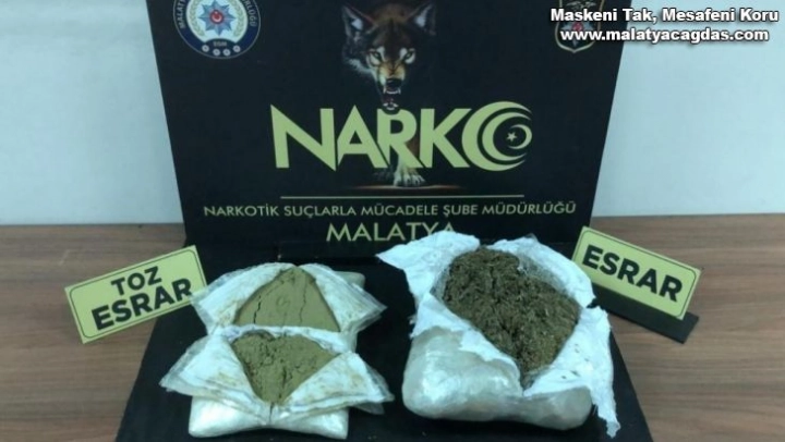 Edinilen bilgiye göre, Malatya Emniyet Müdürlüğü Narkotik Suçlarla Mücadele Şube Müdürlüğü görevlilerince Malatya-Elazığ karayolu üzerinde bulunan uygulama noktasında durdurulan bir yolcu otobüsündeki yolcunun eşyaları arasına gizlenmiş 1 kilo 260 gram toz, 1 kilo 100 gram kubar esrar maddeleri ele geçirildi. Olayla ilgili olarak K.U. isimli şahıs gözaltına alınırken, inceleme başlatıldı.