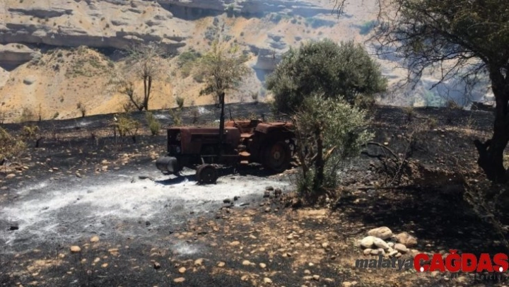 Adıyaman'ın Kahta ilçesine bağlı Erikdere köyü civarında yaklaşık 500 dönümlük alanda çıkan yangında üzüm ve badem bahçeleri ile bir traktör küle döndü.