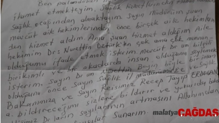Mektubu yazan vatandaş Salih Tanıyan, yazmış olduğu mektubun bir bölümünde şu ifadelere yer verdi: 'Müdürüm, ben bundan önce birçok aile hekiminden hizmet aldım, ama şuan mevcut aile hekimim Dr. Nurettin Öztürk ve aile sağlığı çalışanından çok memnun olduğumu belirtmek istiyorum. Sizin nezdinizde Sağlık Bakanımıza ve Reisimiz Cumhurbaşkanımız Recep Tayyip Erdoğan'a teşekkür ederim. Bu hizmetlerin artarak devam etmesini bekliyorum. '