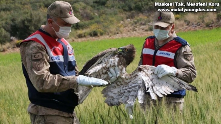 İlçe Jandarma Komutanlığı ekipleri, ilçeye bağlı Meydan Mahallesi'nde yürüttükleri önleyici kolluk devriyesi sırasında, arazide kanadından yaralı ve bitkin halde yılan kartalı buldu.