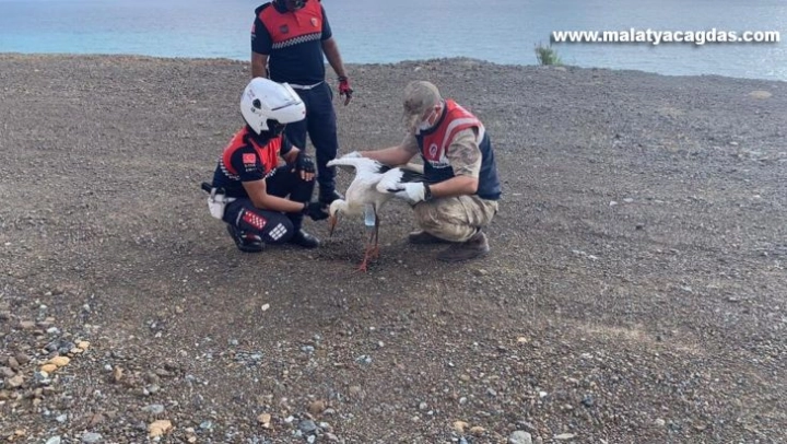 Arsuz/Kale Jandarma Karakol Komutanlığı ekipleri, Arsuz-Samandağ sahil yolu üzerinde yapılan önleyici kolluk devriyesi esnasında yol üzerinde sıcaktan ve açlıktan bitkin halde olan leylek ile karşılaştılar.