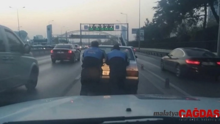 Edinilen bilgiye göre, olay merkez Osmangazi ilçesine bağlı Bursa - İzmir Yolu Acemler Kavşağı'nda meydana geldi. Şahin marka bir otomobil trafiğin en işlek olduğu saatlerde yolda stop edip bir daha çalışmadı. Talihsiz sürücü uzun süre otomobilini çalıştırmak istese de başarılı olamadı. O sırada yoldan geçen Büyükşehir Belediyesi Zabıta Müdürlüğü bünyesinde görevli 2 zabıta memuru durup hemen yardıma koştu. Aracın arkasına geçen 2 memur çalışmayan otomobili metrelerce iteleyip Soğukkuyu Mahallesi'nde boş bir alana çekti. Sürücüye tamirci de ayarlayan ekipler olay yerinden ayrıldı. Zabıtaların yardımsever ve fedakar tavrı vatandaşların da takdirini kazandı.