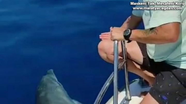 Hatay'ın Samandağ ilçesinde yunuslar, 'gel' diye seslenen balıkçının teknesinin yanında yüzdü. Yunusları ilgiyle izleyen teknedeki balıkçılar o anları cep telefonuyla görüntüledi.