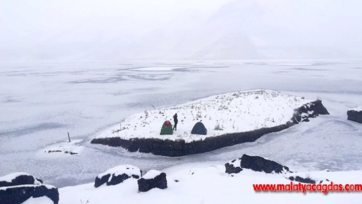 Binlerce yılda oluşan yüzen adaların bulunduğu Çelikhan Çat Baraj Gölü soğuktan dondu. Doğa sporları topluluğu donan gölde yürüyerek yüzen adalarda kamp yaptı.