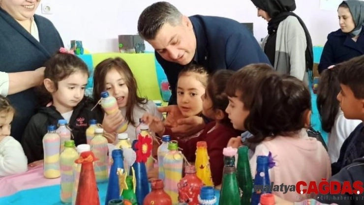 Diyarbakır'ın Çınar ilçesinde anaokulu öğrencileri, öğretmenlerinin de desteği ile Toprak Çöpü Yutar Mı Projesi kapsamında atık malzemelerden yaptıkları ürünleri sergiledi.