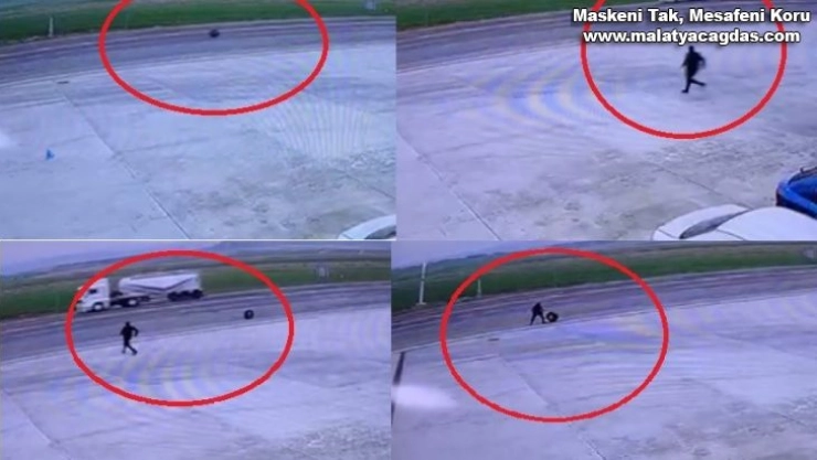 Olay, Elazığ - Bingöl karayolunun 90’ınca kilometresinde Yolçatı mevkiinde meydana geldi. Alınan bilgiye göre, bir kamyonetten fırlayan teker, ana yolda yaklaşık 200 metre gitti ardından da park halindeki bir tırın tekerine çarpıp tekrar dönüşe geçti. Bu sırada dinleme tesisinin çalışanı koşarak tehlike oluşturan tekere müdahale ederek durdurdu. O anlar ise tesisin güvenlik kamerasına saniye saniye yansıdı.