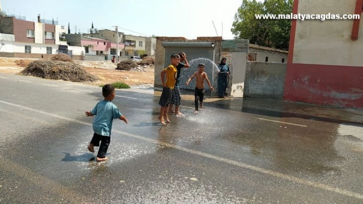 Şanlıurfa’da sıcaktan bunalan çocukların anneleri tarafından hortumla su sıkılarak serinletildiği anlar renkli görüntüler oluşturdu.