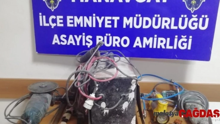 Şüphelilerin aracında yapılan aramada 1 cep telefonu, 2 flash bellek, 1 siyah band rulosu, 1 el testeresi, 1 demir kesme testeteresi, 2 taşınabilir şarj cihazı, 1 yan keski, 1 pense, 1 maket bıçağı, 1 tornavida, 1 kompresör ve 1 demir levye ele geçirildi.