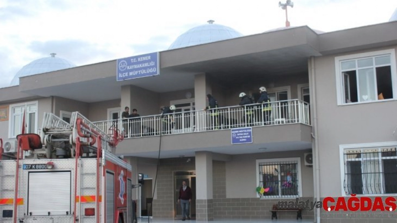 Antalya'nın Kemer ilçesinde müftülük binasında elektrik kontağından yangın çıktı. Yangın, itfaiye ekiplerince söndürülürken yangın sırasında binada Kur'an Kursu eğitimi gören 21 öğrenci, bahçede yangının söndürülmesini beklerken ders çalışmaya devam etti.