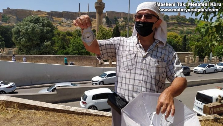 Kronik rahatsızlığı olduğu için başına sardığı ıslak havlu ile ölçümü yapan Tiryakioğlu, sokakta gezen vatandaşların ne kadar sıcağa maruz kaldığını babadan kalma antika termometre ile göstermiş oldu.