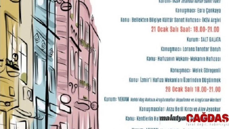 Farklı şehirlerdeki hafıza mekânlarının işlevlerinin üzerinde durulacağı söyleşiler dizisi 14 Ocak’ta “Bellekten Bilgiye Kültür Sanat Hafızası: İKSV” ile başlayacak. Konuşmacı İstanbul Kültür Sanat Vakfından (İKSV) Esra Çankaya olacak. Söyleşiler dizisinin 21 Ocak’ta iki konuğu olacak. SALT GALATA’dan Lorans Tanatar Baruh “Hafızanın Mekânı Mekânın Hafızası”, akademisyen Prof. Dr. Melek Göregenli “İzmir’i Hafıza Mekânları Üzerinden Düşünmek” üzerine konuşacak. Söyleşiler dizisi 28 Ocak’ta Koç Üniversitesi Vehbi Koç Ankara Araştırmaları Uygulama ve Araştırma Merkezinden (VEKAM) Arzu Beril Kırıcı ve Alev Ayaokur’un “Kentlerin Hafızası: Müzeler ve Bellek Merkezleri” söyleşisiyle sürecek. Aynı gün APİKAM Müdürü Dr. Serhan Kemal Saygı ve Uzman Gözde Yılmaz’ın “APİKAM’ın bellek mekânı olarak işlevi” hakkındaki sunumlarıyla da dizi sona erecek.