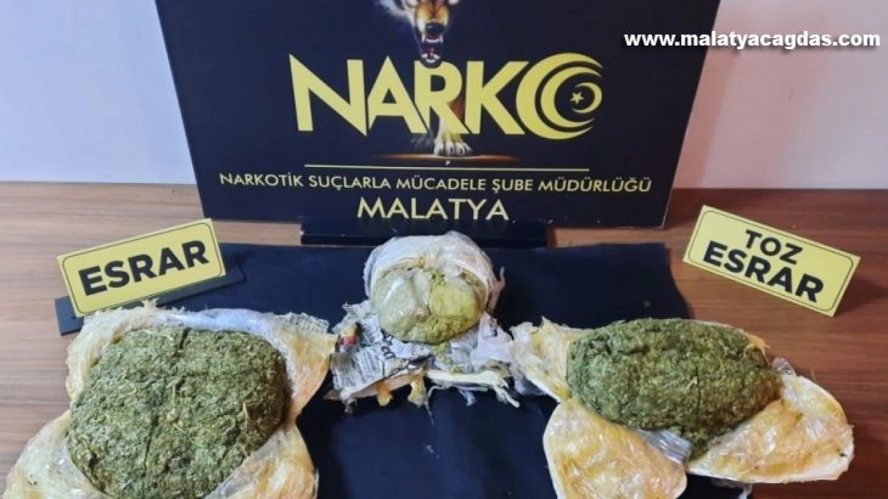 Edinilen bilgilere göre, Malatya Emniyet Müdürlüğü Narkotik Suçlarla Mücadele Şube Müdürlüğü görevlilerince Doğu illerinden Batı illerine uyuşturucu sevkiyatı yapacağı değerlendirilen bir araçta Kale İlçesi yol uygulama noktasında arama yapıldı. Yapılan aramalarda 2 kilo 396 gram kubar 1 kilo 235 gram ise toz esrar ele geçirildi.