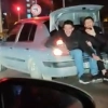 Elazığ’da bir aracın bagaj kısmını oturan 2 kişi, arızalanan TOFAŞ Doğanı iple çekti.