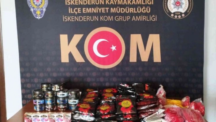 Edinilen bilgiye göre, Hatay Emniyet Müdürlüğü görevlilerince kaçakçılık olaylarının önlenmesine yönelik yapılan çalışma çerçevesinde İskenderun Kaçakçılık ve Organize Suçlarla Mücadele Grup Amirliği tarafından M.D.K. adlı şahsın Arsuz’un Şarkonak Mahallesinde bulunan iş yerinde yapılan aramada, 10 bin adet gümrük kaçağı makaron, 57 kilo gümrük kaçağı nargile tütünü ele geçirildi.