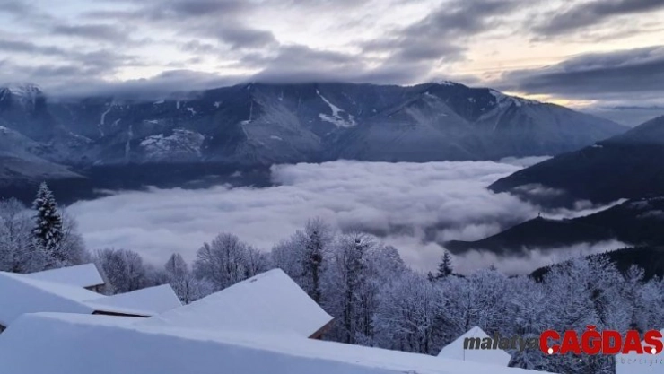 Artvin'de karlı dağların üzerini kaplayan bulutlar, görenleri kendisine hayran bıraktı.